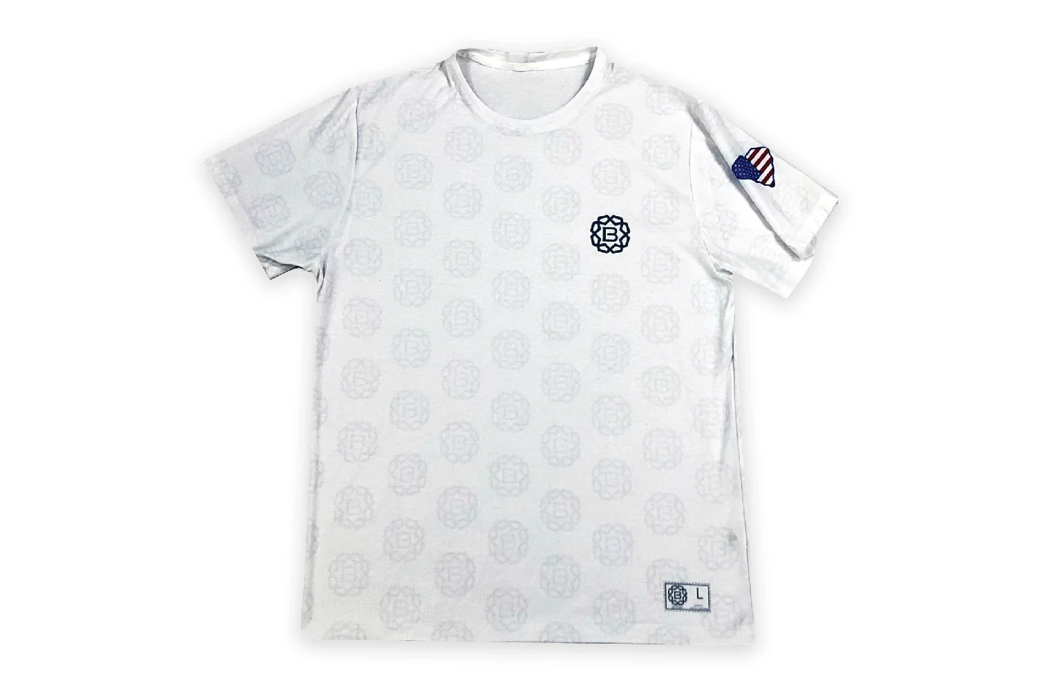Special Touches. Your logo is featured in bold at left chest AND as a faded all-over print. Your American-flag is imprinted in the state shape of your choice (optional). It's a t-shirt that deserves a spot in the closet.