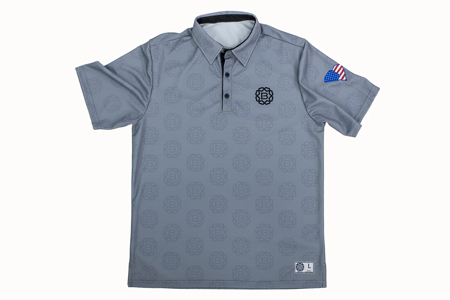 Special Touches. Your design is featured in bold at left chest AND as a faded all-over print. Your interior collar is accented to match. US-flag imprinted within state shape of your choice (optional).